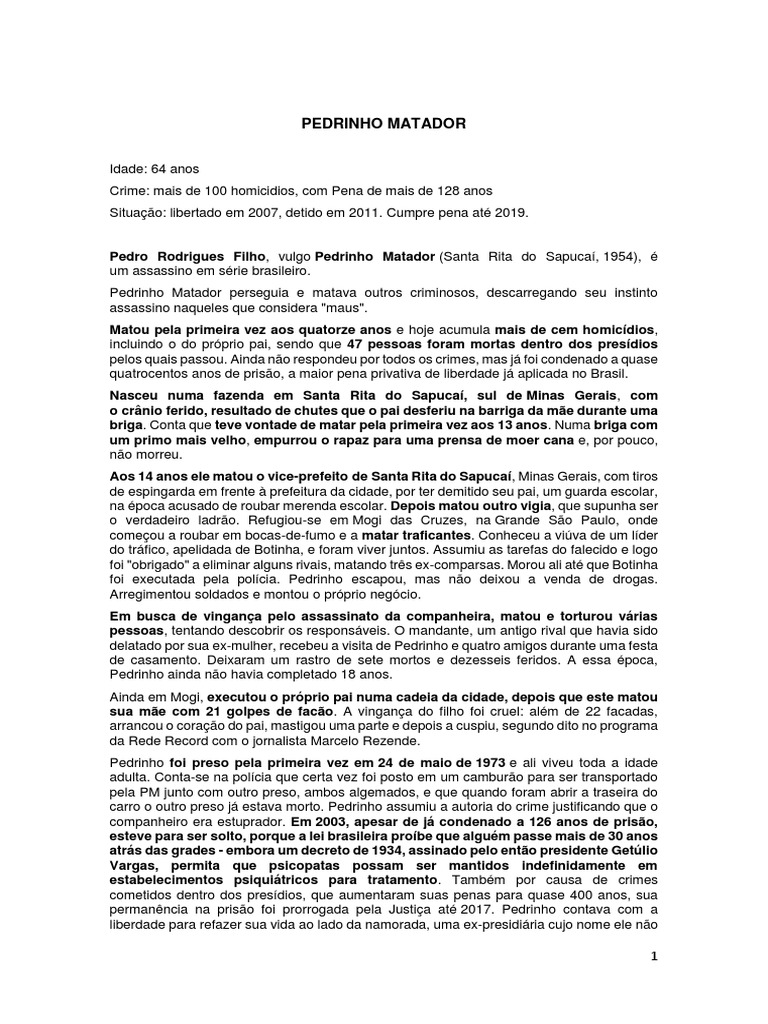 Vou começar a postar a história de alguns serial killers. His victims included 47 people who were. Pedro rodrigues filho, conhecido como pedrinho matador entrou para a história da criminalidade brasileira na década de 70. Pedrinho matador (mato por prazer). Na verdade, os psiquiatras brasileiros afirmam que ele se encaixa perfeitamente no perfil de psicopata.